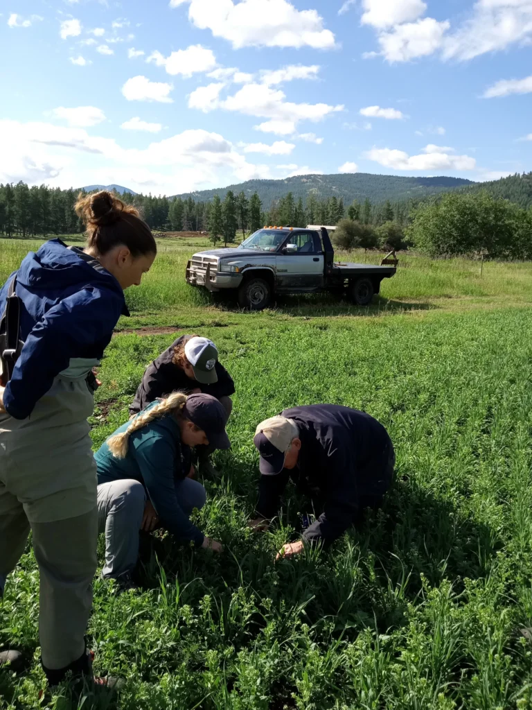 Montana DEQ staff and rancher Pete Wade examine plants in his reseeded pasture.