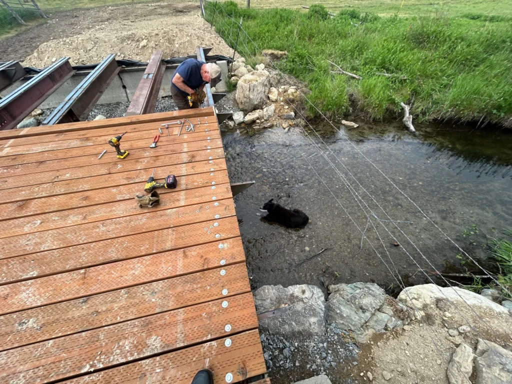 Landowner Pete Wade (supervised by his dog) working on the bridge in July 2025.