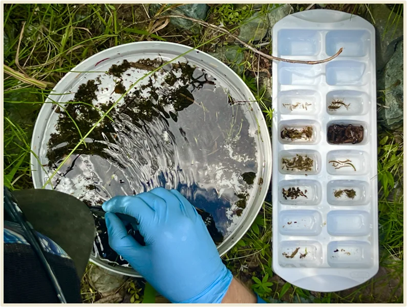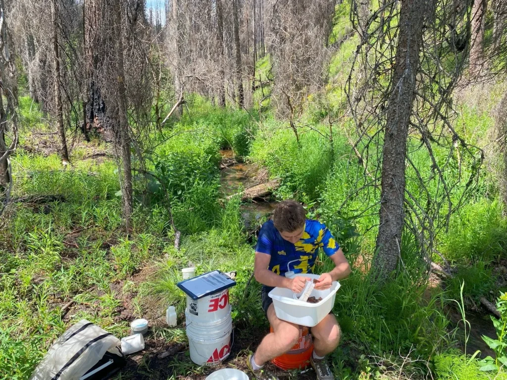 University of Montana undergraduate intern Benjamin Brady collecting algae samples at Colt Creek, which burned in 2023. Photo: Jacob McArtor.