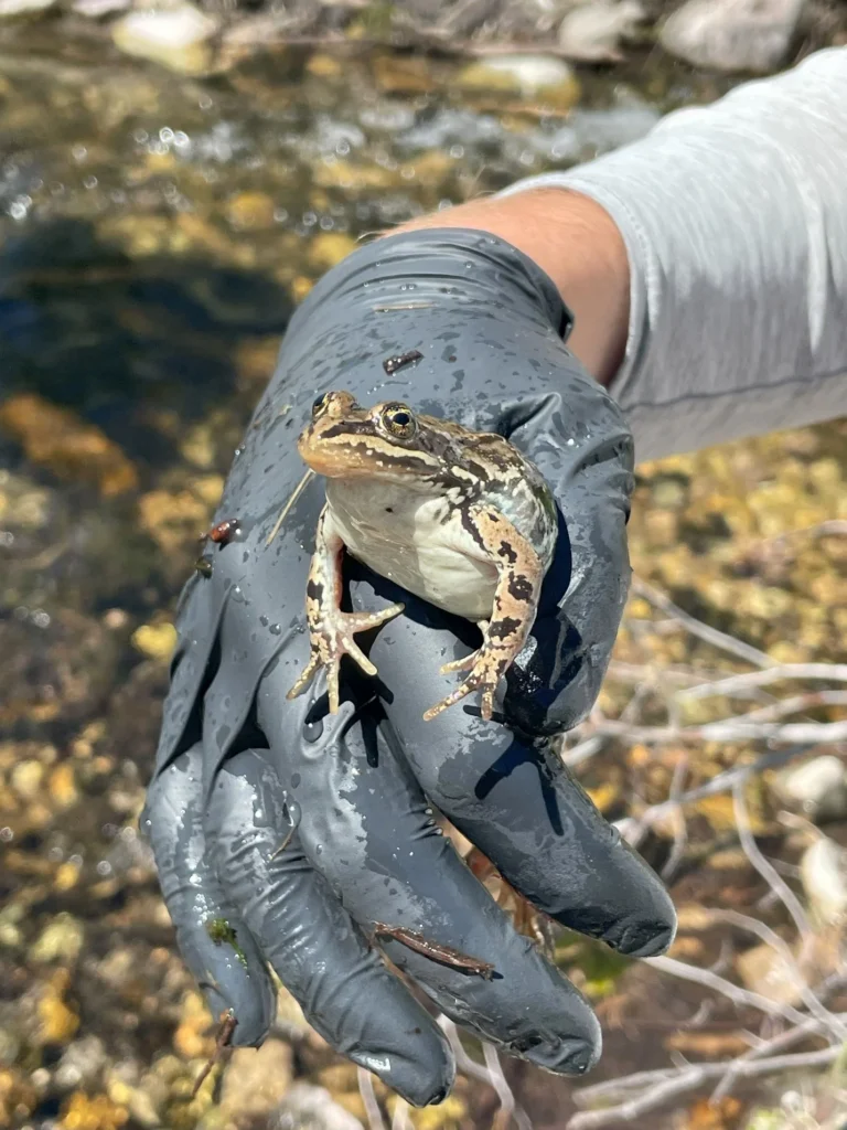 A Columbia Spotted Frog captured at Grouse Creek near Wise River, MT. Amphibians can also be affected by changes to streams following wildfire. Photo: Jacob McArtor.